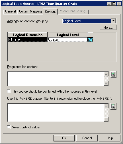 「LTS2 Time Quarter Grain」論理表ソースをダブルクリックして、Logical Table Sourceダイアログ・ボックスを開きます。