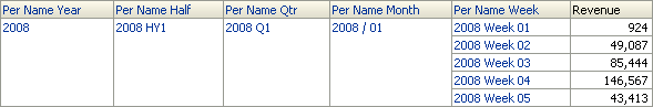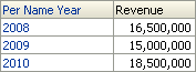 Revenue 3-Period Rolling Sumは年単位で計算されます。 PERIODROLLING関数が設定されたメジャーでは、問合せの単位に基づく結果が計算されます。