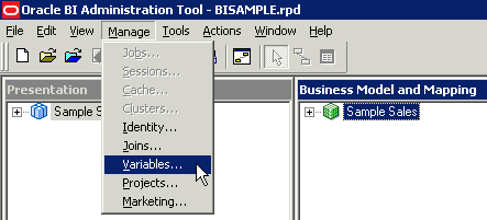 リポジトリで変数を使用すると、管理作業を合理化したり、変化し続けるデータ環境に合わせてメタデータ・コンテンツを動的に変更したりすることができます。 変数は、どの時点においても1つの値を持ちます。 変数は、Administration ToolのExpression Builderまたはエンドユーザー分析で、リテラルまたは定数の代わりに使用できます。 変数は実行時にOracle BI Serverによって値に置き換えられます。