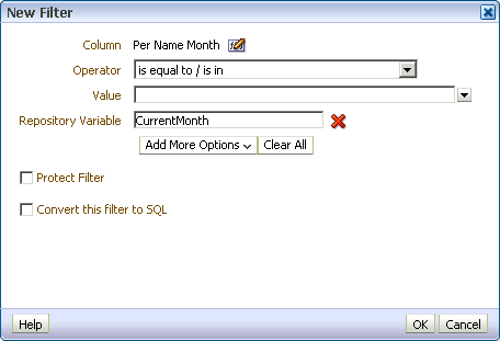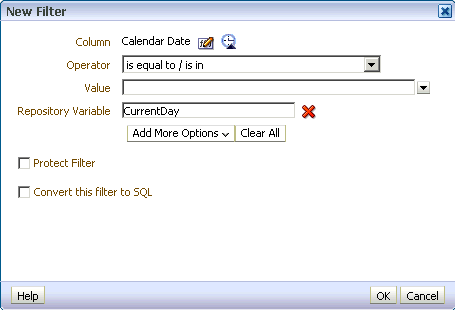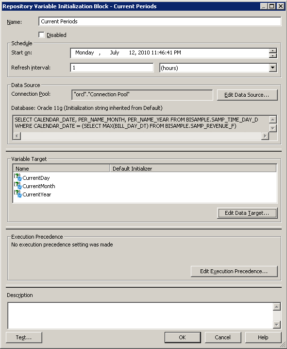 ここでは、新しい初期化ブロック(Current Periods)と、3つの新しい動的リポジトリ変数(CurrentYear、CurrentMonth、およびCurrentDay)を作成します。 その後、Oracle BIの分析でこの変数を列フィルタとして使用します。 Administration ToolのVariable Managerを使用して、変数および初期化ブロックを定義します。