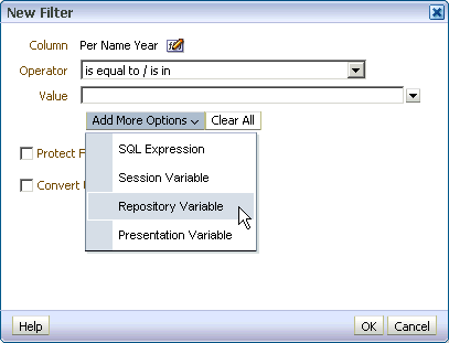 Per Name Year列の「Filter」をクリックします。 New Filterダイアログ・ボックスが開きます。