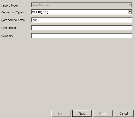 Connection Typeを「OCI 10g/11g」に変更します。 選択した接続タイプに基づいて接続フィールドが画面に表示されます。