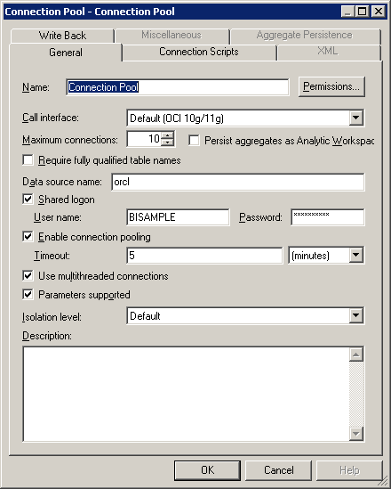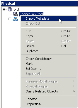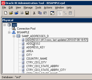 メタデータをインポートするとき、データソースのプロパティの多くはインポート処理の際に収集された情報に基づいて自動構成されます。 インポート後には、データソースのメタデータに存在しない結合関係といった物理データソースの他の属性を定義することもできます。 Physicalレイヤーには、データベース、フラット・ファイル、XML文書などを含むデータソースが1つ以上存在することがあります。 ここでは、Oracle BI 11g Sample Applicationに付属のサンプルのBISAMPLEスキーマから表をインポートして構成します。