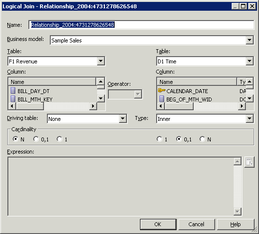 結合式がないことを確認してください。 BMM(Business Model and Mapping)レイヤーの結合は論理結合です。 論理結合は論理表の間のカーディナリティ関係を表し、有効なビジネス・モデルに必須のものです。 論理表結合を指定する必要がある理由は、ビジネス・モデルに対する論理要求を物理データソースに対するSQL問合せに変換するために必要なメタデータをOracle BI Serverに持たせるためです。 論理結合は、Oracle BI Serverがビジネス・モデルのさまざまな部分の間の関係を把握するのに役立ちます。 問合せがOracle BI Serverに送信されると、サーバーは論理モデルの構造を検査して物理問合せの構築方法を決定します。 論理結合の検査はこのプロセスの重要な部分です。 ある表が、他の論理表に結合する論理結合のすべてで"多"の側にある場合、Administration Toolはその表を論理ファクト表と見なします。