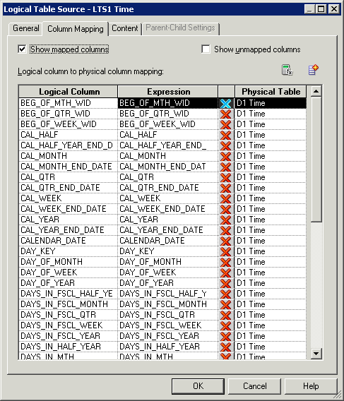 「D1 Time」論理表ソース(論理表ではありません)をダブルクリックして、Logical Table Sourceダイアログ・ボックスを開きます。
