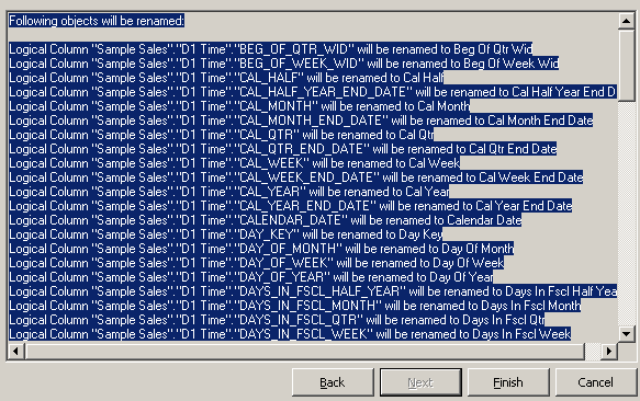 「Next」をクリックしてFinish画面を開きます。 選択した名前変更ルールに従ってすべての論理列の名前が変更されることを確認します。