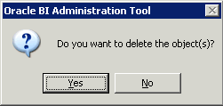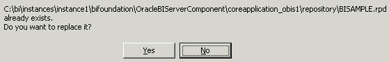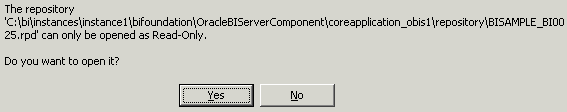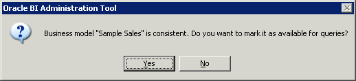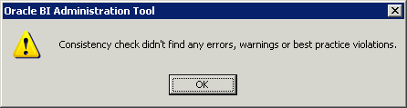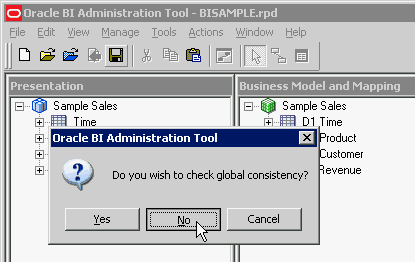 全体の整合性を確認するプロンプトが表示されたら、「No」をクリックします。 全体の整合性の確認とは、リポジトリ全体に対してエラーのチェックを行うというものです。 もっとも一般的なチェックは、Business Model and MappingレイヤーおよびPresentationレイヤーで実施します。 これらのレイヤーはまだ定義されていないので、リポジトリの他のレイヤーを構築するまではチェックを省略します。 整合性の確認については後で説明します。