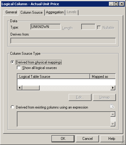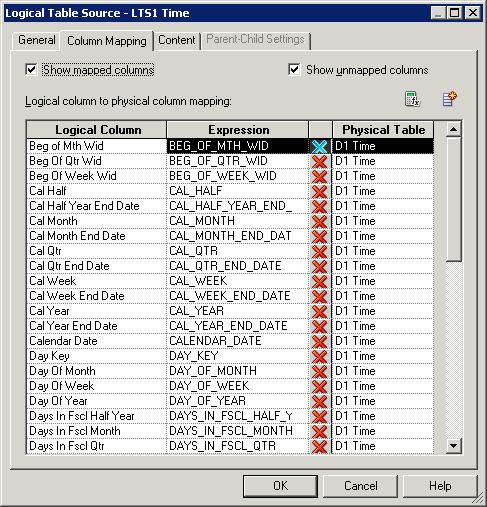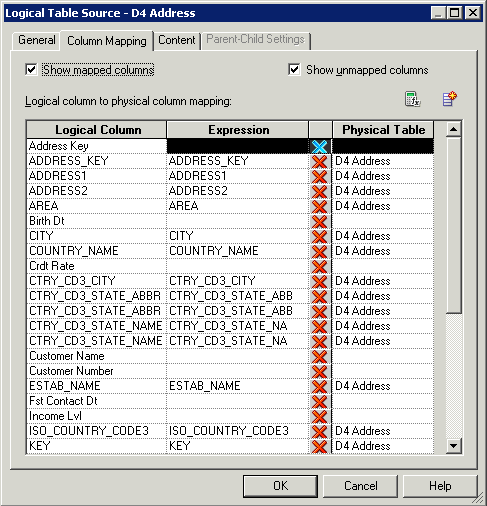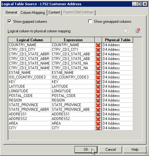 Column Mappingタブで、論理列から物理列へのマッピングが定義されていることを確認します。 マッピングが表示されない場合は、「Show mapped columns」を選択します。