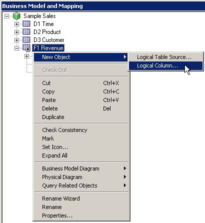 「F1 Revenue」論理表を右クリックして、「New Object」→「Logical Column」を選択します。
