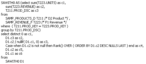 ログを調査します。 今回は、詳細表、D1 TimeおよびF1 Revenueが問合せで使用されていることを確認します。 これは、要求されたデータ(月別の売上)が、集計表に含まれるコンテンツより低いレベルにあるためです。 集計表にはデータが含まれないため、問合せでは詳細表が使用されます。 集計のナビゲーションは、論理表ソースに設定した集計コンテンツ・レベルで制御されます。