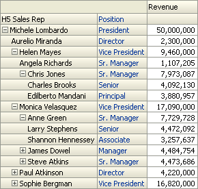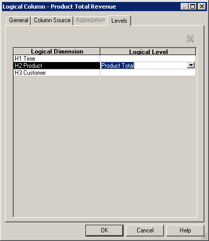 説明:ここでは、ファクト表の集計コンテンツをディメンション階層で対応するレベルに設定しています。 次の手順では、Timeディメンションの集計論理表ソースに対して同じレベルを設定します。 Quarterに設定されているH1 Time論理ディメンションを除き、すべてのレベルが合計レベルに設定されていることを確認します。 これにより、ユーザーが特定のレベルに対して問合せを実施する場合、Oracle BI Serverは詳細表の代わりに集計表へアクセスすることになります。 たとえば、ユーザーが四半期ごとの製品別合計売上げを問い合わせると、サーバーはF2 Revenue Aggregateファクト表およびこれに対応する集計ディメンション表であるD1 Time Quarter Grainにアクセスします。 ユーザーが、たとえばQuarterの代わりにMonthといったように、ここで指定したレベルよりも低いレベルに対して問合せを実行すると、サーバーは詳細表(F1 RevenueおよびD1 Time)にアクセスします。 ユーザーが高いレベル(Quarterの代わりにYear)に対して問合せを実行した場合は、集計表が使用されます。これは、問合せを論理レベルまたはそれ以上のレベルに対して実行すると、必ず集計表が使用されるためです。