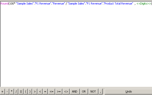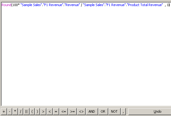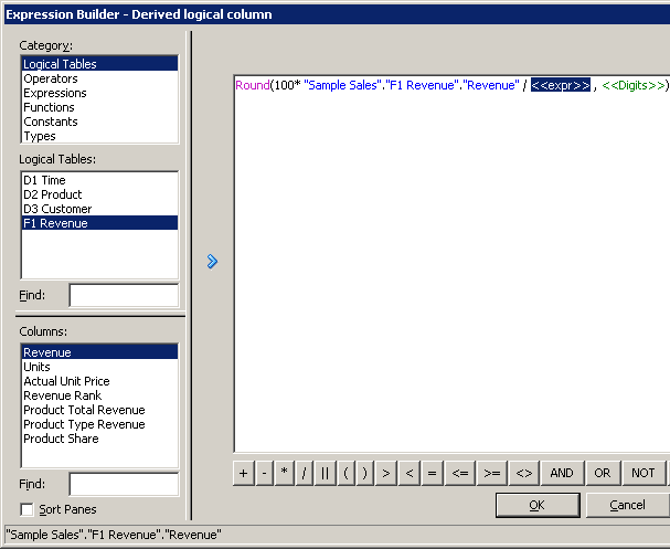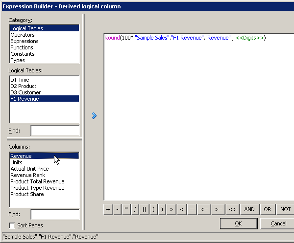 「Logical Tables」→「F1 Revenue」を選択し、「Revenue」をダブルクリックして計算式に追加します。
