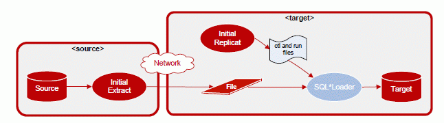 異種データベース間で初めてデータをロードするには、GoldenGateアプリケーションを使用して初期データのロードを実行します。この処理中、アプリケーションは稼働を継続できます。 直接的な方法は、Extractを使用してソース・ファイルからデータを抽出し、ターゲット・システムのReplicatに直接データを送信する方法です。