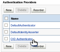 「Reorder」をクリックして、構成済みの認証プロバイダの順序を変更します。 OPSSの概念に関する自習コースで学習したとおり、OPSSはWebLogic Serverドメイン内で見つかった認証プロバイダの構成から認証構成を取得します。 また、OPSSは、はじめにリストに含まれるすべてのLDAPベースの認証プロバイダを参照してから、もっとも高い制御フラグ設定を持つリスト内の最初のプロバイダを選択します。 ここでは、2つのLDAPベースの認証プロバイダに対してSUFFICIENT制御フラグ設定を使用するように構成したため、現在の構成のままでは、OPSSはDefaultAuthenticatorを使用します。 新しく構成したOID Authenticatorが認証プロバイダとして認識されるようにするには、OID認証プロバイダがリスト内の最初に来るように、認証プロバイダのリスト順序を変更する必要があります。
