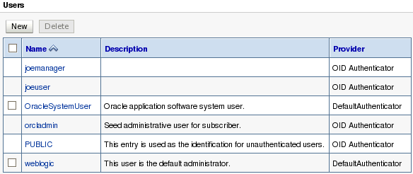 WebLogic管理コンソール内で「Security Realms」→「myrealm」→「Users and Groups」タブを選択します。 Usersサブタブがデフォルトで選択されています。 joemanagerやjoeuserなど、『OPSS環境のセットアップ』のOBEで確認したユーザーが表示されます。 ユーザーが取得された認証プロバイダが各ユーザーの横に表示されている点に注意します。