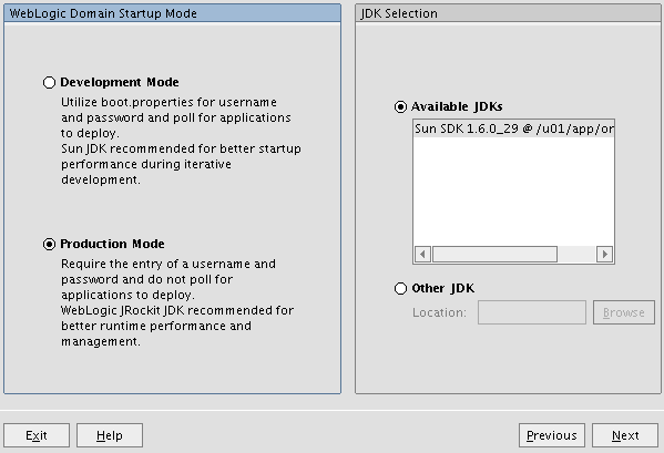 Configure Server Start Mode and JDK画面で、WebLogic Domain Startup Modeの下の「Production Mode」オプションを選択します。 「Available JDKs」を選択してから、その下の「Sun JDK」を選択します。 このチュートリアルではこのJDKのみがリストに表示され、あらかじめ選択されています。 「Next」をクリックします。