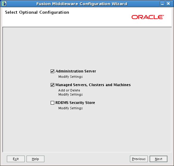 Select Optional Configuration画面で、「Administration Server」と「Managed Servers, Clusters and Machines」を選択します。 「Next」をクリックします。