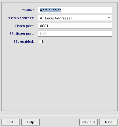 Configure the Administration Server画面で、NameフィールドとListen addressフィールドをデフォルト値のままにします。 このチュートリアルでは、マシン上の別のプログラムによってデフォルト・ポートである7001が使用されていたため、Listen portは8001に変更されています。 SSL enabledオプションは選択しません。 「Next」をクリックします。