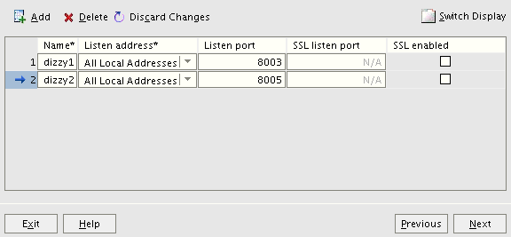 再度、「Add」ボタンをクリックします。 新しい行で、管理対象サーバーのNameフィールドにdizzy2と入力します。 Listen addressフィールドはデフォルトのAll Local Addressesのままにします。 Listen portを8005に変更します。 SSL enabledオプションは選択しません。 「Next」をクリックします。