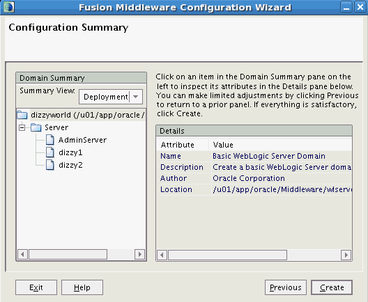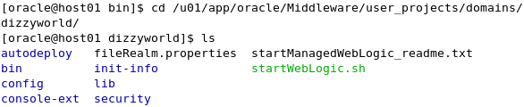 新しく作成したドメインのディレクトリ構造とファイルを表示するには、ターミナル・ウィンドウで次のコマンドを入力します。 $ cd /u01/app/oracle/Middleware/user_projects/domains/dizzyworld 注: ドメインを異なる場所に配置した場合は、cdを使用してそのディレクトリに移動してください。