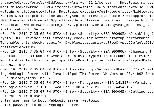 ドメインの管理サーバーを起動するには、ドメイン・ディレクトリから次のコマンドを入力します。 $ ./startWebLogic.sh
