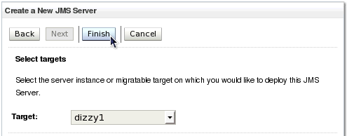 "JMS Server created successfully"というメッセージが表示されます。 注: ドメイン内でdizzy1がクラスタに含まれている場合、選択肢としてdizzy1とdizzy1 (migratable)が表示されます。 JMSサーバーの宛先には1つのWebLogicサーバー・インスタンスしか設定できませんが、"migratable"オプションを選択した場合、障害発生時にクラスタ内の別のWebLogicサーバー・インスタンスに移行できます。