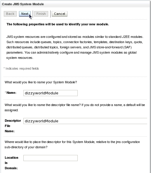 Create JMS System Module画面で、NameにdizzyworldModuleと入力します。 また、Descriptor File NameにdizzyworldModuleと入力します。 Location in Domainは空白のままにします。 「Next」をクリックします。