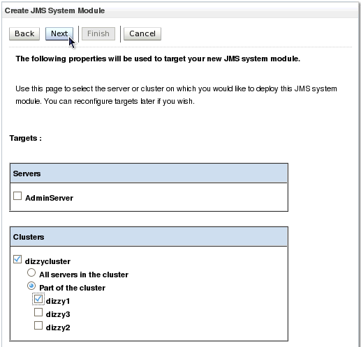 次の画面で、Subdeploymentsドロップダウン・リストを使用して「dizzysubmodule」を選択します。 選択すると、Targets領域が入力され、ターゲットがJMSサーバーdizzyworldJMSServerに設定されていることが分かります。 「Finish」をクリックします。