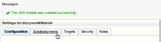 "Subdeployment created successfully"というメッセージが表示されます。 注: 前述のとおり、ドメインにクラスタが含まれない場合や別のサーバーが定義されている場合、ターゲット画面の表示は異なります。