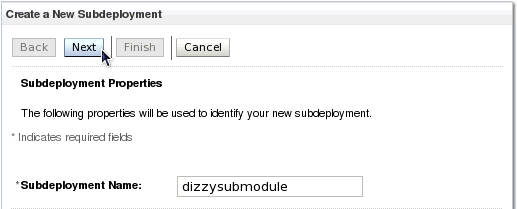 Create a New Subdeployment画面で、Subdeployment Nameにdizzysubmoduleと入力します。 「Next」をクリックします。