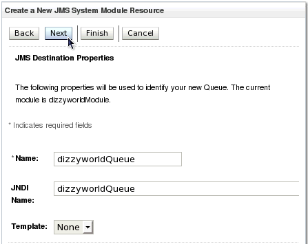 次の画面で、NameにdizzyworldQueueと入力します。 また、JNDI NameにdizzyworldQueueと入力します。 TemplateはNoneのままにします。 「Next」をクリックします。