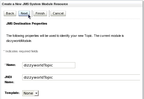 次の画面で、NameにdizzyworldTopicと入力します。 また、JNDI NameにdizzyworldTopicと入力します。 TemplateはNoneのままにします。 「Next」をクリックします。