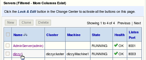 Domain Structureで「Environment」を展開し、「Servers」をクリックします。 Servers表で、サーバー「dizzy1」をクリックします。