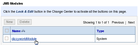 管理コンソールへ戻ります。 Domain Structureで「Services」から「Messaging」へ戻り、「JMS Modules」をクリックします。 JMS Modules表で「dizzyworldModule」リンクをクリックします。