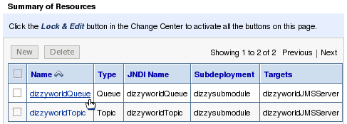 管理コンソールのDomain Structureで「Services」→「Messaging」へ戻り、「JMS Modules」をクリックします。 JMS Modules表で「dizzyworldModule」リンクをクリックします。