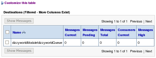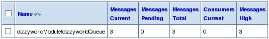 Destinations表でdizzyworldModule!dizzyworldQueueの横に表示されるエントリを確認します。 キューに送信したメッセージの数がMessages Totalに表示されます。