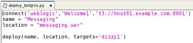 次に、messaging.warファイルのあるディレクトリに移動します。 このチュートリアルで使用したディレクトリは、/home/oracle/jmsobeです。 提供されたWLSTスクリプトdeploy_testjms.pyを実行する前に、このスクリプトを編集する必要があります。 スクリプトの1行目では、connect()コマンドが使用されています。 このコマンドの最初の引数はドメイン管理者のユーザー名であり、2番目の引数はユーザー・パスワードであり、3番目の引数はドメイン管理サーバーのホストおよびポートです。 スクリプトを実行する前に、使用するドメインに合った引数の値を指定してください。 必要な変更をスクリプトに加えたら、ファイルを保存します。