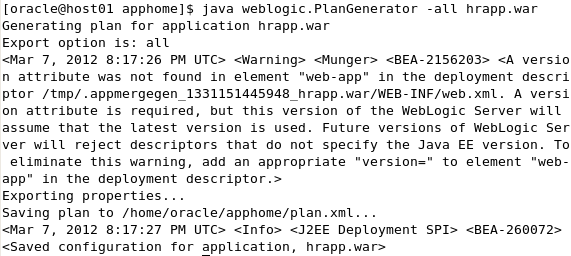 WLSTスクリプトを実行したターミナル・ウィンドウに戻ります。 現在のディレクトリが<APP_HOME>のままであることを確認します。 このチュートリアルで使用したディレクトリは、/home/oracle/apphomeです。 次のコマンドを入力し、hrapp.warファイルに対してPlanGeneratorツールを実行します。 $ java weblogic.PlanGenerator -all hrapp.war