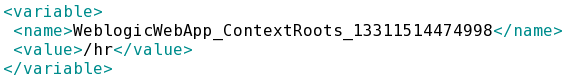 ファイルを保存します。 このデプロイメント・プランは、WebLogic ServerのWebアプリケーション・デプロイメント・ディスクリプタであるweblogic.xmlに含まれるcontext-root要素をオーバーライドします。 新しいコンテキスト・ルートは/hrになります。 |