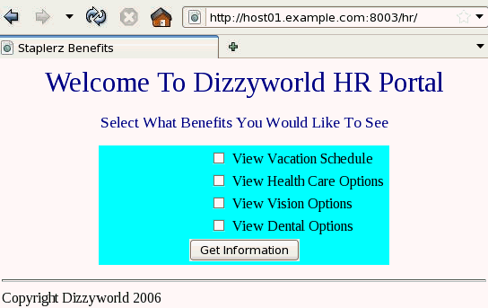 アプリケーションの新しいコンテキスト・ルートを検証します。 Webブラウザでdizzy1管理対象サーバーのホスト名とポートを入力し、最後に/hrを付けます。