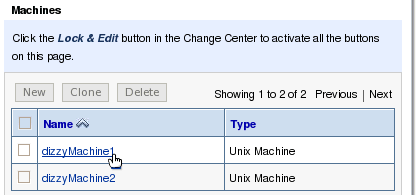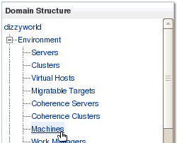 チュートリアルOracle WebLogic Server 12c: Creating and Configuring Machinesで作成されたマシンの構成を確認します。 Domain Structureで「Environment」を開き(横にある「+」をクリック)、 「Machines」をクリックします。