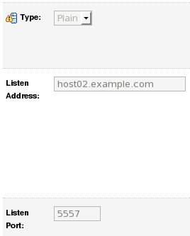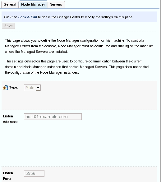このマシン向けのノード・マネージャ設定が表示されます。 TypeはPlainに設定されており(つまり、Javaベースのノード・マネージャがSSLを使用しない)、Listen Addressはhost01.example.comに、Listen Portは5556に設定されています。