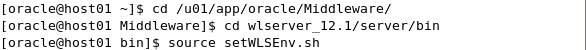 host01にアクセスします。 ターミナル・ウィンドウで<MIDDLEWARE_HOME>/wlserver_12.1/server/binに移動します。 setWLSEnv.shスクリプトを実行して、Oracle WebLogic Scripting Tool(Oracle WLST)に必要な環境を次のとおりに設定します。 $ source setWLSEnv.sh