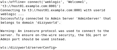 WLSTプロンプトに次のコマンドを入力して、実行中の管理サーバーに接続します。 wls:/offline> connect('<ユーザー名>', '<パスワード>', 't3://<管理ホスト>:<管理ポート>') 使用するドメイン環境に応じて、サンプルの引数値を置き換えてください。 このチュートリアルで使用したコマンドは、以下のとおりです。 wls:/offline> connect('weblogic', 'Welcome1', 't3://host01.example.com:8001')