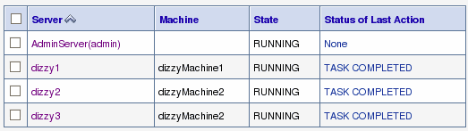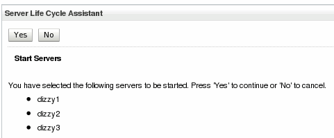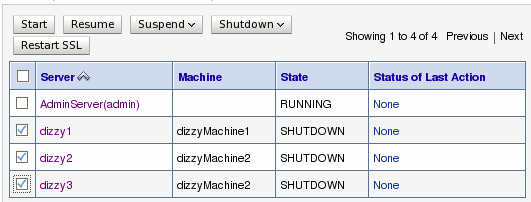 すべての管理対象サーバー(dizzy1、dizzy2、dizzy3)のチェック・ボックスを選択します。 「Start」ボタンをクリックします。