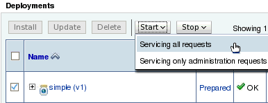 Deployments表で、simpleアプリケーションの左にあるチェック・ボックスを選択します。 「Start」ドロップダウン・リストを使用して「Servicing all requests」を選択します。