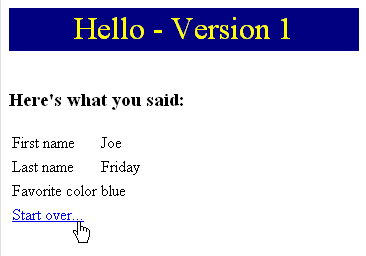 古いバージョンが今でも古いユーザーに対して実行されているかどうかを確認するには、開いたままにしておいたWebブラウザに戻ります。 フィールドに情報を入力し、「OK」ボタンをクリックします。 2番目の画面に"Version 1"と表示されることを確認します。 HTTP Sessionが有効である限り、古いユーザーは引き続き"Version 1"を使用します。