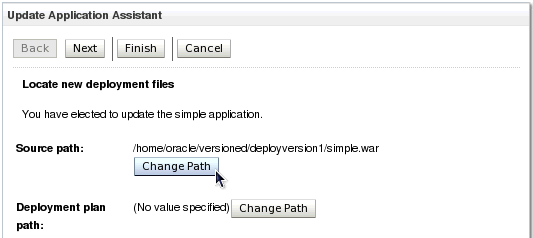 Current Locationフィールドを探します。 リンクを使用して、zipファイルが解凍された場所を表示します。 deployversion2ディレクトリへ移動します。 simple.warとその横にラジオ・ボタンが表示されます。 このラジオ・ボタンを選択します。 リンクとラジオ・ボタンを使用すると、コンソールによって自動的にPathフィールドが入力されます。 代わりに、Pathフィールドに手動でパスとファイル名を入力することもできます。 「Next」をクリックします。