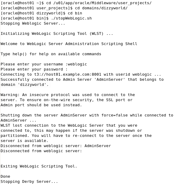 ドメインの管理サーバーが実行中である場合は、これを停止します。 ターミナル・ウィンドウでstartスクリプトを使用して管理サーバーを起動した場合、このウィンドウで[Ctrl]を押しながら[C]キーを押してサーバーを停止します。 または、別のターミナル・ウィンドウでドメイン・ディレクトリに移動してから、cdを使用してbinサブディレクトリに移動します。 このチュートリアルで使用したディレクトリは、/u01/app/oracle/Middleware/user_projects/domains/dizzyworld/binです。 次のコマンドを入力します。 $ ./stopWebLogic.sh これによって、ドメインの管理サーバーを停止するスクリプトが実行されます。 ユーザー名とパスワードを入力するよう指示されたら、ドメイン管理者の資格証明を入力します。
