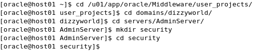 ターミナル・ウィンドウで、ドメイン・ディレクトリに移動します。 このチュートリアルで使用したディレクトリは、/u01/app/oracle/Middleware/user_projects/domains/dizzyworldです。 cdを使用してservers/AdminServerサブディレクトリに移動します。 注:管理サーバーの名前が異なる場合、cdを使用してservers内の該当ディレクトリに移動します。 securityという名前のサブディレクトリを作成し、cdを使用してここに移動します。 $ mkdir security